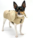Every Pup needs a Classic Trench Coat as part of their wardrobe to keep them dry and chic this Spring. The sturdy cotton canvas exterior stands up against wind and rain. Unisex design looks adorable on any good boy or girl. Adjustable velcro straps at the chest and belly. Sizes xx-small and x-small have a built-in D-ring so you can attach your favorite leash. Sizes Small and Medium have a harness slit for easy pairing with your favorite walkwear. Machine washable on gentle cycle with cold water, lay flat to dry. Available in XX-Small, X-Small, Small, and Medium, please see our size chart in the last image slide to find their best fit.
