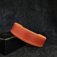 This collar has a 4 mm thick base layer from Italian belt leather and a Patented Soft Cushion made out of Orthopedic Foam on the inside.